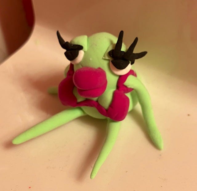 This frog in my cousin’s bathroom hit me because we both spent a lot of time getting ready for something and then had trouble seizing the moment at hand.