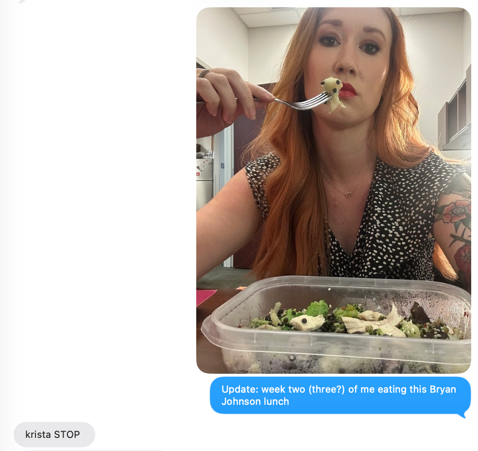 Image: A real low point for me was the month-long period when I ate like Bryan Johnson, aka that guy who wants to live forever, and started texting unsolicited images of me with my tasteless green slop to friends.